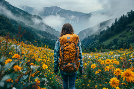 Back person contemplating an immense landscape covered with fog from the top of a mountain at sunrise. Traveler escaping in solitude into the wilderness. Connection to nature to the great outdoors.