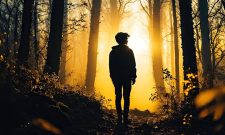 Man walking in the forest at sunrise. Travel and adventure concept.