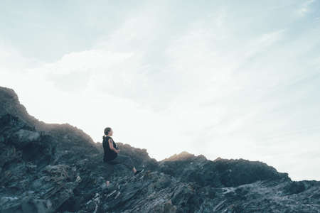 Close up woman standing on rock concept photo. Highland nature. First view hand photography with large stones on background. High quality picture for wallpaper, travel blog, magazine, article