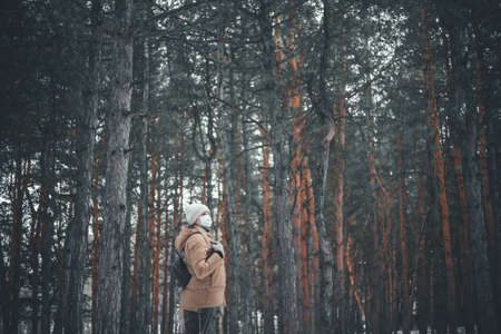 A young woman with blond hair in a medical mask is walking in the forest.