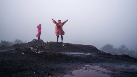 couples tourist with rain coat walking travel adventure nature in the rain forest. travel nature, Travel relax, Travel Thailand, rainy season, Happy, romantic.