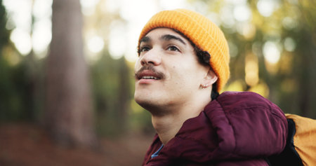 Thinking, hiking and man in woods, journey and energy with fitness, environment and weekend break. Outdoor, healthy person or hiker with contemplation, calm or travel with nature, trekking or holiday