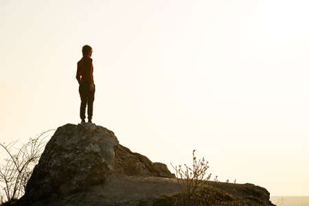 Hiker with backpack standing on the edge of the cliff and looking at the sunset