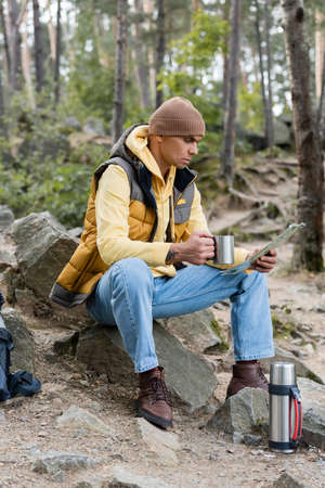 tourist looking at map while sitting with metal mug in forest