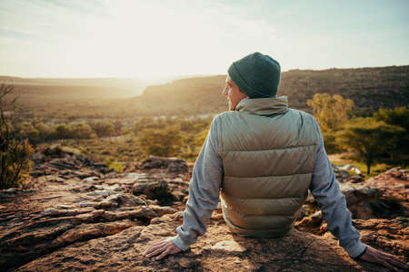 Caucasian male adventurer hiking in mountain during sunset wearing backpack