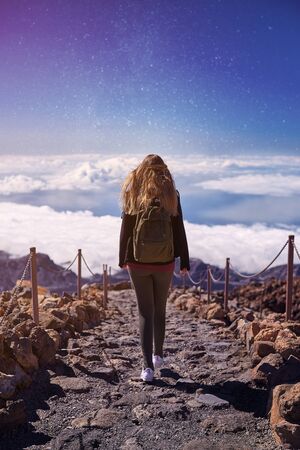 Young woman hiking on Teide volcano in Spain