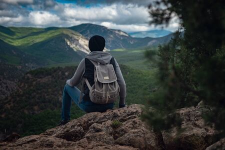 A male tourist with a backpack climbs the mountains, panorama. A traveler on the background of mountains, rear view. A tourist with a backpack on the background of mountains. Copy space