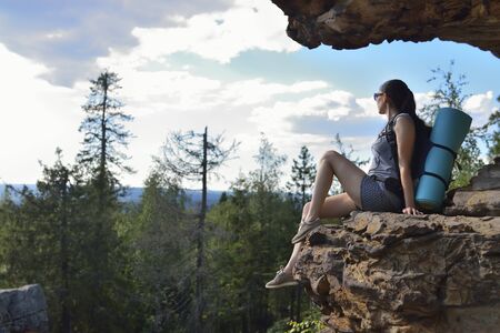 A beautiful girl sits on a mountainside and looks. Rural landscape. Beautiful nature. Sunny evening.