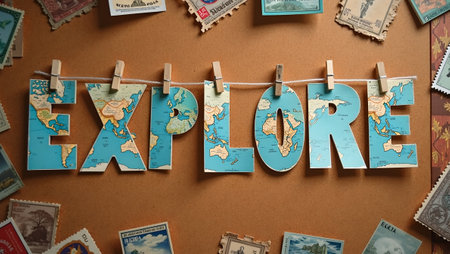 Vintage corkboard with explore spelled out in travel postcards and stamps evoking adventure