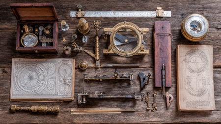 Old scientific instruments are displayed together on a wooden surface for research purposes, showcasing their historical significance in science.
