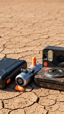 A vertical, tall 9:16 still life photograph emphasizing negative space. A rugged portable phone char