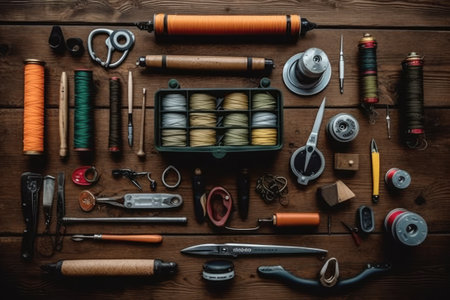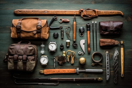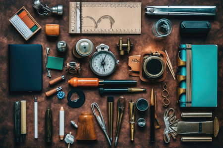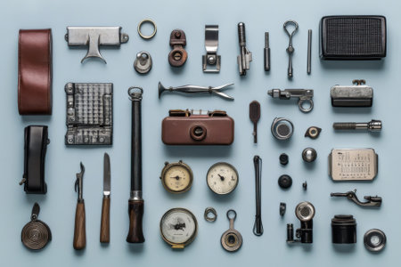A captivating arrangement of vintage tools and accessories showcasing various elements of craftsmanship. Ideal for creative projects and artistic inspirations.