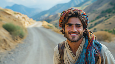 Generative AI Image of Arabian Man Wearing Turban Smiling with Road Hills View View on Sunny Day