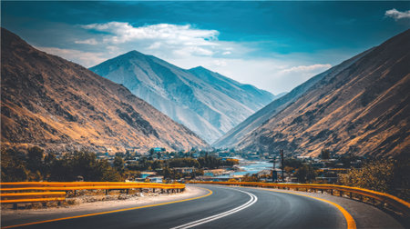 Scenic asphalt road curves along a river in a colorful autumn valley surrounded by rugged mountains with villages below a blue sky dotted with clouds