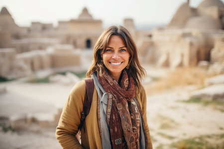 Portrait of a beautiful middle-aged woman with long brown hair, wearing brown jacket, scarf and jeans, standing in front of the ancient ruins of Cappadocia, Turkey