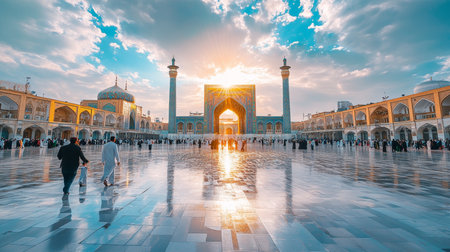 Iconic view of central Asia mosque at sunset, inspired by isphahan culture. Beautiful Islamic architecture. Travel, culture and education concept