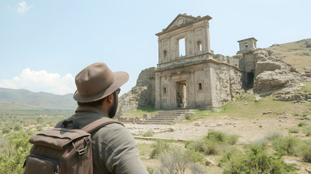 Tourist with backpack and hat looking at the ruins of the ancient city of Persepolis, Iran