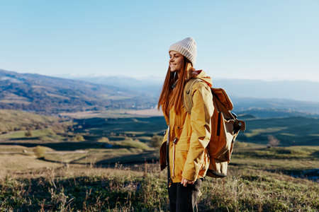 portrait of a woman in warm clothes in the mountains in autumn landscape tourism