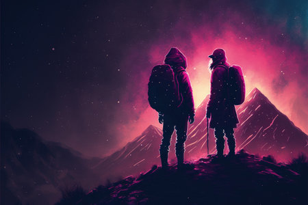 Pair of trekkers standing atop the summit gazing at multiple suns in the sky. Fantasy concept, Illustration painting. Generative AI