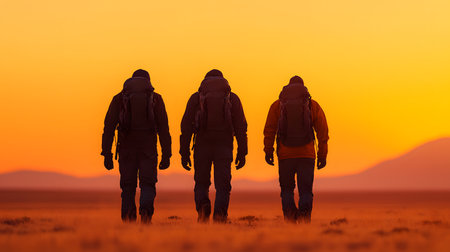 Three hikers, silhouetted against a vibrant sunset, make their way across the expansive terrain. The atmosphere exudes tranquility and a sense of adventure, with mountains in the distance.