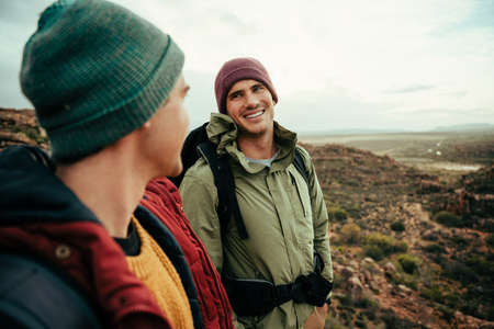 Two caucasian male friends on vacation walking in the wilderness embracing nature