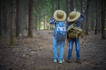 Adventure and nature exploring for kids. Two curious kids in pith helmets, denim clothes and backpacks walk together along the path exploring a pine forest. Active children. Copy space.