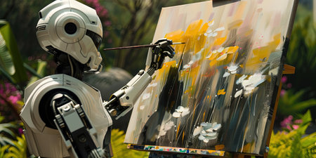 Artificial intelligence robot working on easel in the garden. Technology concept.