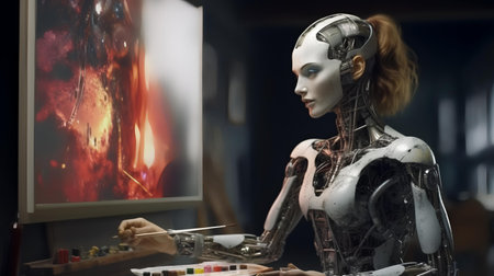 3d rendering of a female robot working in an art studio.