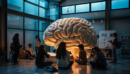 A creative workshop held inside a lifesized model of a human brain, symbolizing the pooling of ideas and creativity
