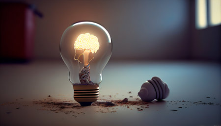 Human brain forming inside a vibrant light bulb, symbolizing inspiration generative ai