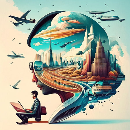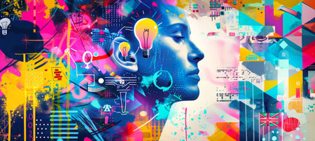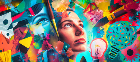 A vibrant and abstract collage featuring a womans profile, light bulbs, and brain imagery.