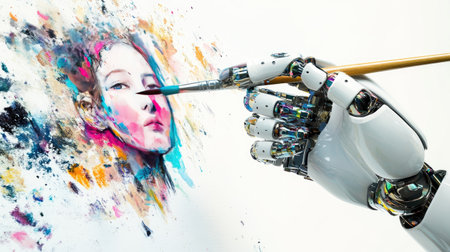 A futuristic robot hand grasping a paintbrush, delicately painting an abstract self-portrait, with vibrant colors and a clean white background.