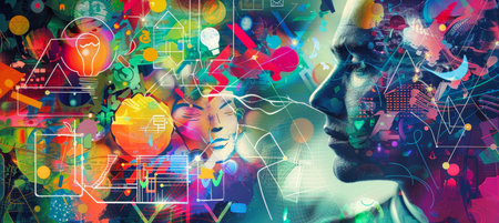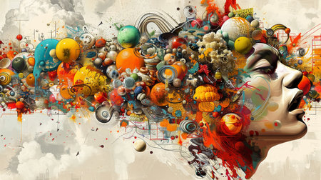 A colorful collage featuring a mans face surrounded by abstract shapes and symbols, representing a kaleidoscope of thoughts and ideas.