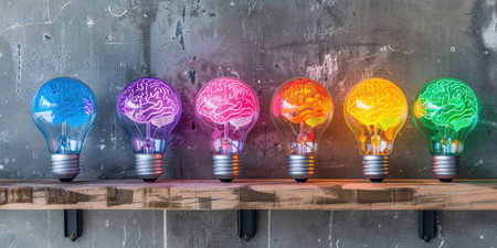Six colorful lightbulbs with brains inside, arranged on a wooden shelf against a textured gray background.