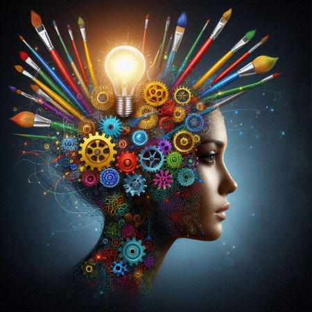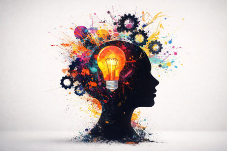 AI generated human head silhouette with glowing lightbulb colorful paint splashes and gears symbolizing creativity inspiration innovation and human thinking process