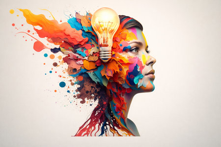 AI generated profile of a woman with a glowing lightbulb and colorful paint splashes symbolizing creativity inspiration innovation and human imagination on a clean background