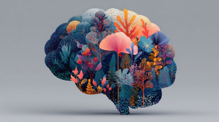 This vivid illustration features a brain intertwined with lush plants, reflecting creativity and growth. It symbolizes the connection between nature and mental well-being.