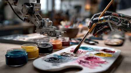 A robotic hand delicately mixes vibrant colors on a palette, surrounded by jars of paint in a creative art studio, showcasing technology's role in art.