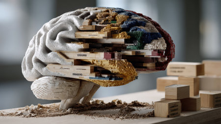 This artistic representation features a brain made from wooden blocks, symbolizing creativity, thought, and modern design. A captivating fusion of art and science.