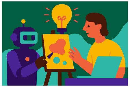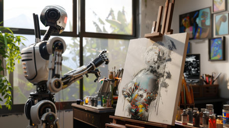 AI Artistic Muse. An advanced AI, represented as a sleek, featureless android, stands in an artists brightly lit studio. It