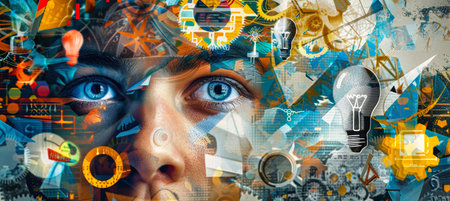 A vibrant digital collage depicting a persons face surrounded by abstract shapes, lightbulbs, and lines, symbolizing the complexity and creativity of human thought.