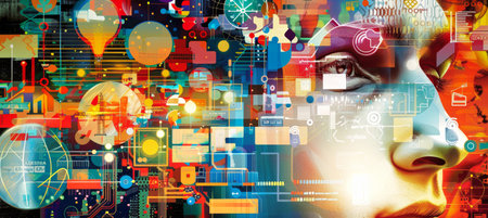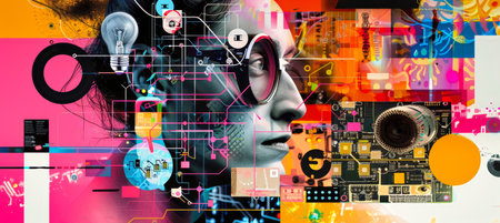 A colorful collage depicting a womans face with technological elements like circuit boards, a light bulb, and a digital eye.