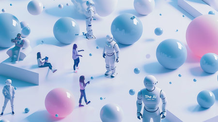 elements such as a robot or AI icons, people building a community. The color scheme are blue, white turcoise and lila