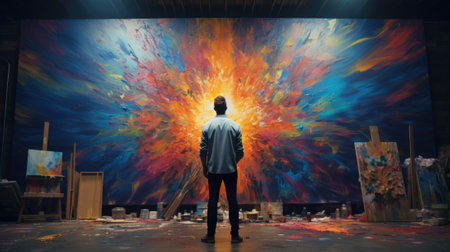 A man standing in front of a large painting, AI