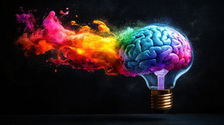 A neon-colored brain graphic inside a light bulb, representing creative thinking and vibrant ideas in psychology and neuroscience.