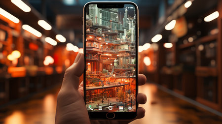 Hand Holding Smartphone with Augmented Reality View of Warehouse
