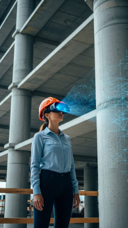 Female construction worker in vr glasses engages with holographic modern building projection