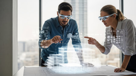 Two individuals are depicted inside, using augmented reality glasses. They are examining a digital projection of a building plan. The composition highlights a bright, modern aesthetic, with a soft focus background. This image is suitable for illustrating innovation, design, and technological advancements.