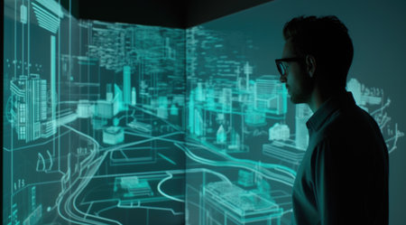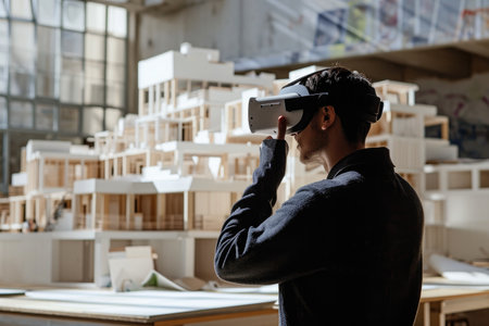 user explores virtual models of urban structures through augmented reality glasses merging digital visualization with real life elements in a contemporary workspace.