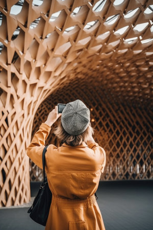shot of a woman taking pictures while standing in front of wold architecture